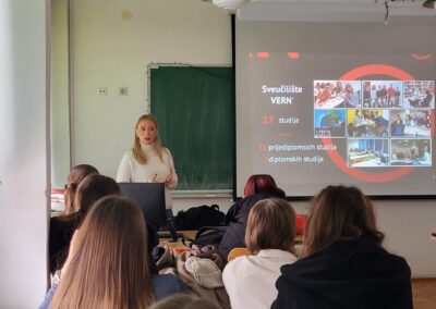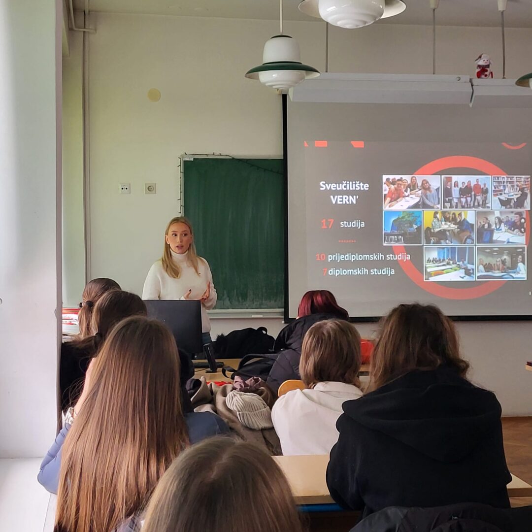 Susret je protekao u ugodnoj i poticajnoj atmosferi, a učenicima su na početku podijeljeni prigodni pokloni. Predstavnice su na jasan i zanimljiv način govorile o studijskim programima, načinu studiranja, praktičnoj nastavi te mogućnostima zapošljavanja nakon završetka studija. Posebnu pozornost privukla su dva promotivna videa koji su na moderan i dinamičan način prikazali studentski život i radnu atmosferu na Sveučilištu VERN’.